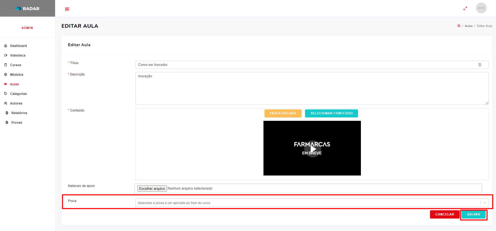 Com a prova criada, deve ser inserida dentro da aula pertencente ao curso que será certificado.