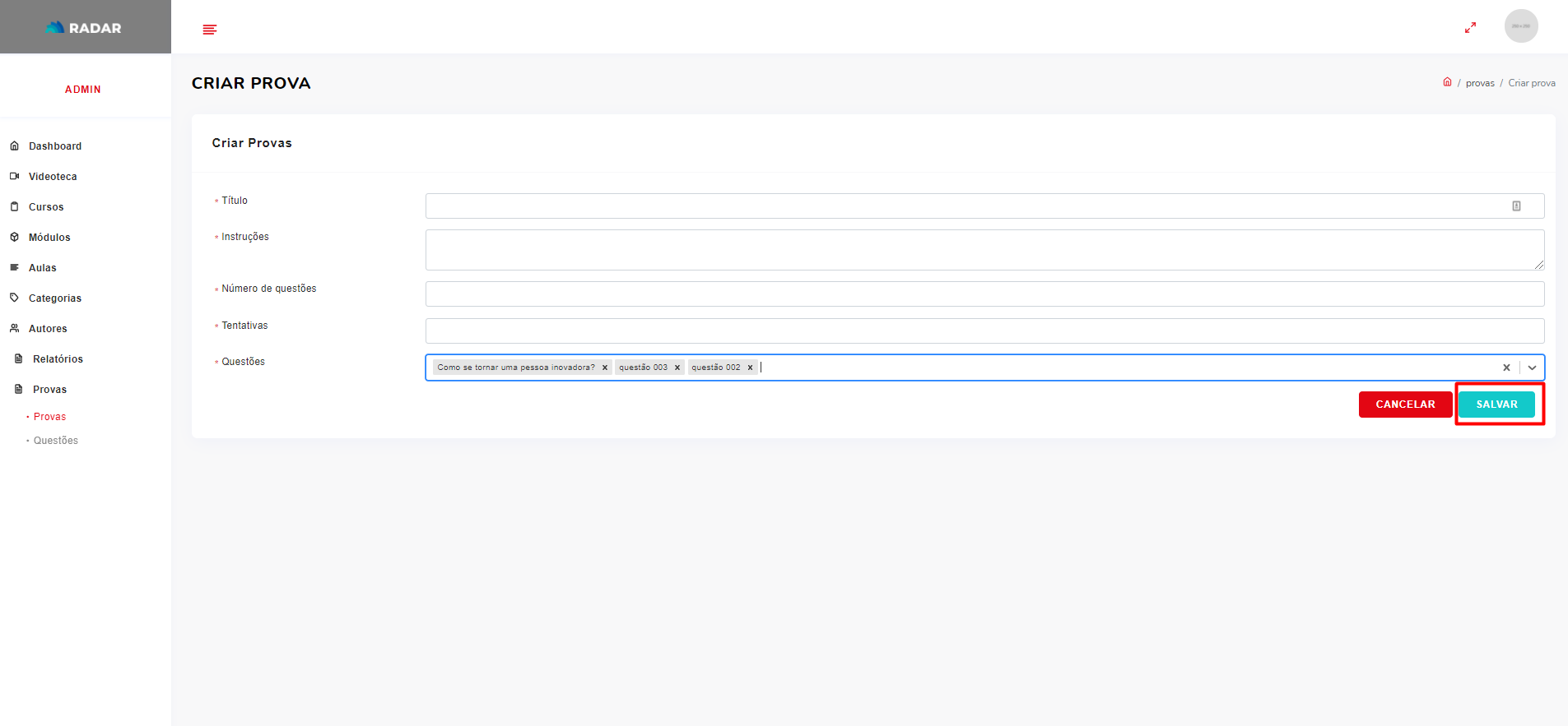 Após preencher todos os campos e inserir as questões, clique em “Salvar”