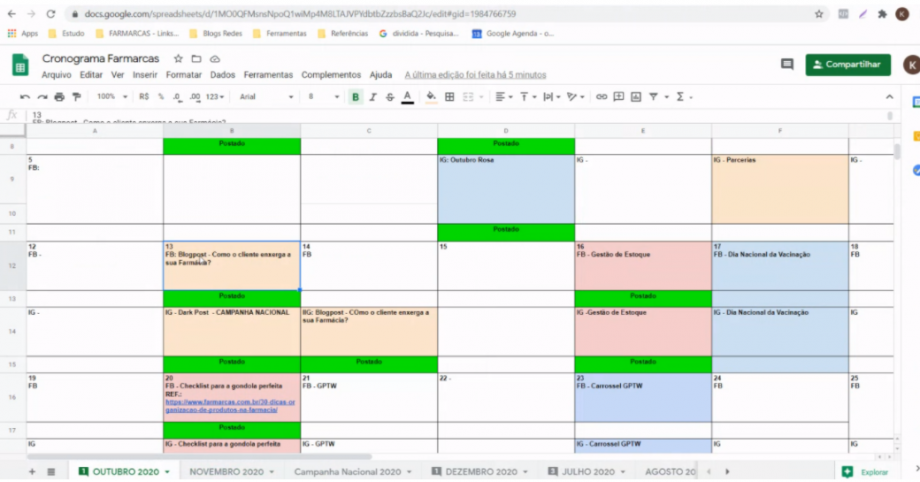 Atualizar o calendário com o que está programado, publicado e caso ocorra, com os posts que estavam previstos e não foram publicados. Status: programado, postado e não postado