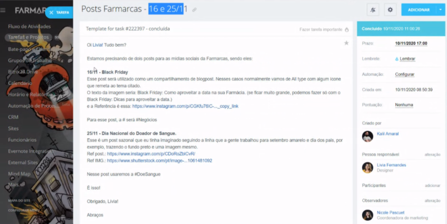 Abrir tarefa para designer e redator no Bitix