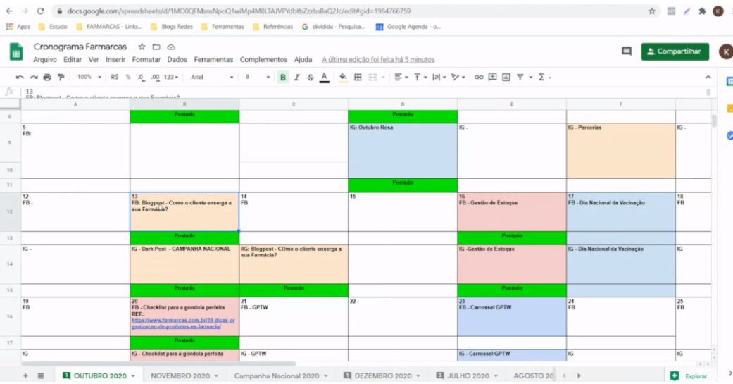 Atualizar o calendário com o que está programado, publicado e caso ocorra, com os posts que estavam previstos e não foram publicados. Status: programado, postado e não postado