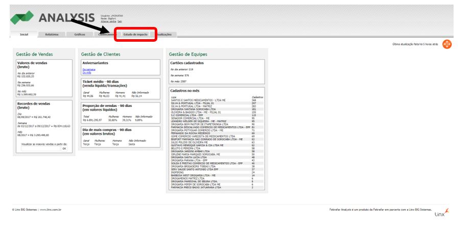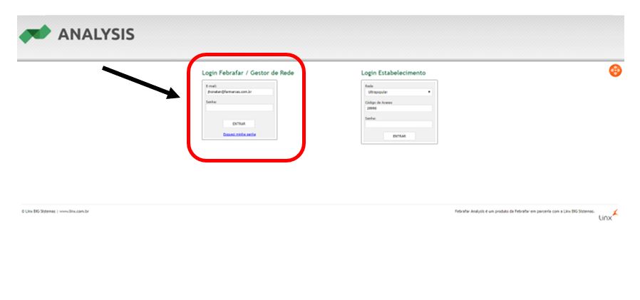 - Para acessar o estudo de impacto, basta entrar no site do Febrafar Analysis e no canto superior esquerdo, colocar o login e senha da rede que deseja trabalhar.
