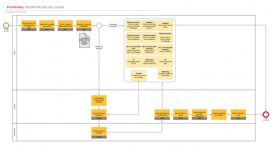 O associado comunicará a área de Sucesso do Associado sobre sua saída da Farmarcas e o anjo responsável por essa loja irá realizar a abertura da tarefa ao Jurídico.