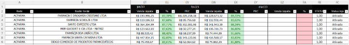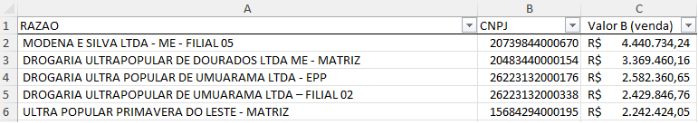 Após baixar o relatório organize as colunas na sequência: rede, CNPJ, razão e venda.