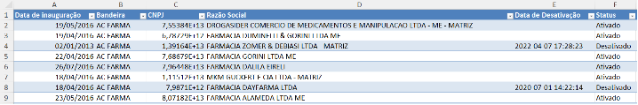 Filtre essas lojas (desconsidere lojas com status desativadas e montando), copie as informações de rede, razão social, CNPJ, data de inauguração e cole no final das linhas da planilha EFETIVIDADE PEC.