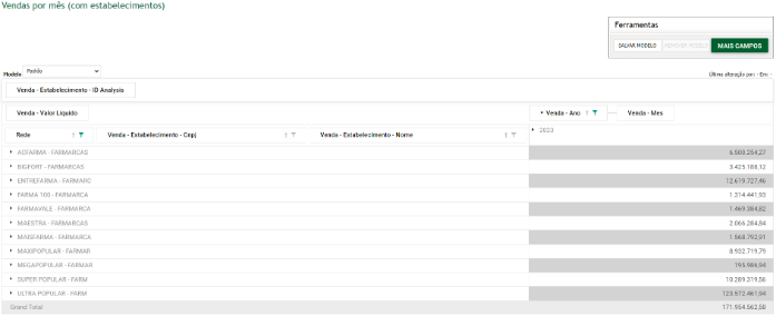 Utilizando a opção “mais campos” personalize quais tipos de dados o relatório trará. Precisaremos das seguintes informações: Venda liquida, bandeira (rede), CNPJ e razão.
