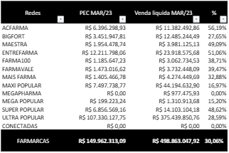 Planilha que apresenta o acompanhamento de vendas realizadas na modalidade fidelidade em todas as lojas filiadas a Farmarcas.