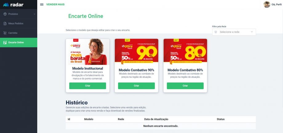 O encarte online foi desenvolvido na plataforma Radar para que os associados consigam criar seus próprios encartes inserindo os produtos e promoções da loja.
