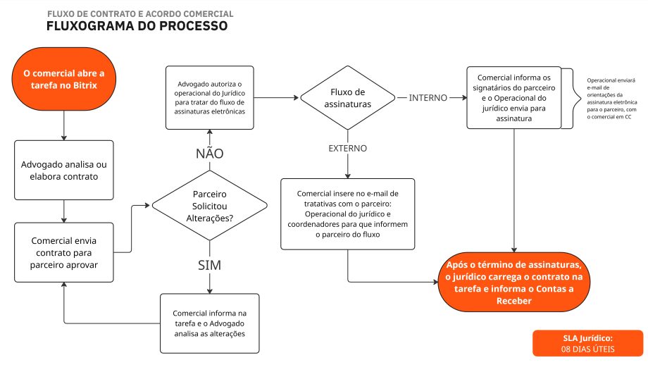 1 – Fluxo Interno: O departamento comercial informa quem assinará como representante legal e testemunha do parceiro e o time operacional do jurídico enviará o documento para assinaturas eletrônicas, informando o passo a passo para os signatários.