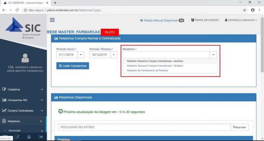 Os relatórios do SIC de compra normal (OL) e compra centralizada são dados que mostram a movimentação de compra por meio do nosso canal de compras (SIC), nele é possível visualizar as informações dos pedidos feitos pelo associado ou que foram gerados pelo sistema automaticamente, verificar o valor de faturamento, a data e horário de edição do pedido.