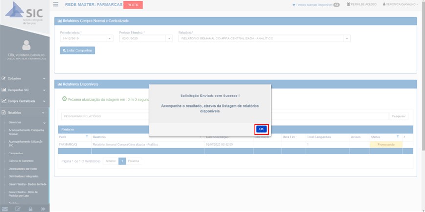 Após clicar em enviar a solicitação de relatório, clicar em “OK” na confirmação de envio