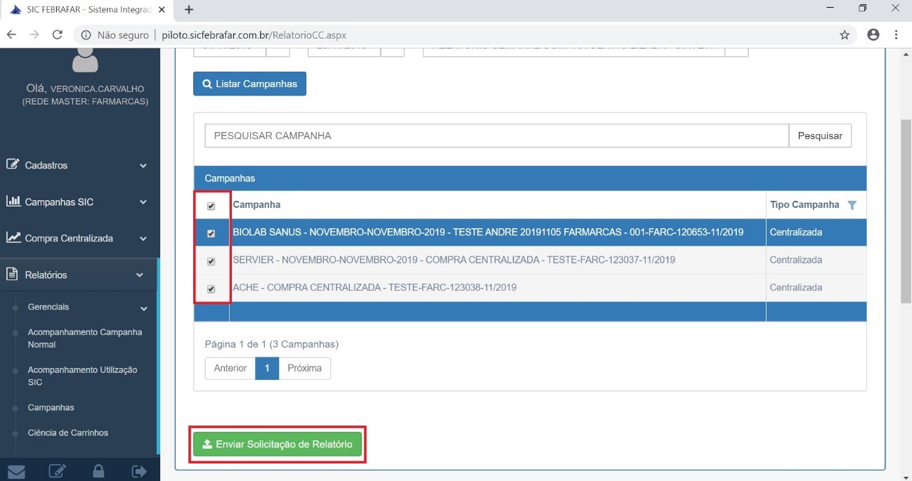 Selecionar todas as campanhas que deseja gerar relatório e clicar em “Enviar Solicitação de Relatório”