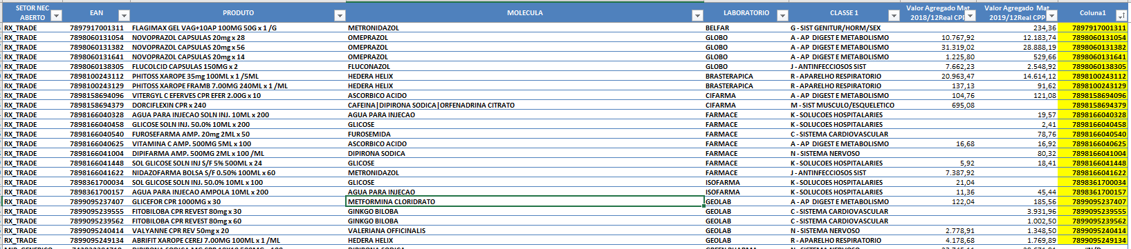 Neste relatório contém diversos não parceiros. É importante uma análise minuciosa para identificar quais moléculas podem ser substituídas por parceiros. Em casos de moléculas exclusivas de um laboratório não parceiro sugerimos incluir no mix de produtos, entretanto, atentar-se a margem de lucro, possivelmente não será um produto de cestão ou de encarte promocional.