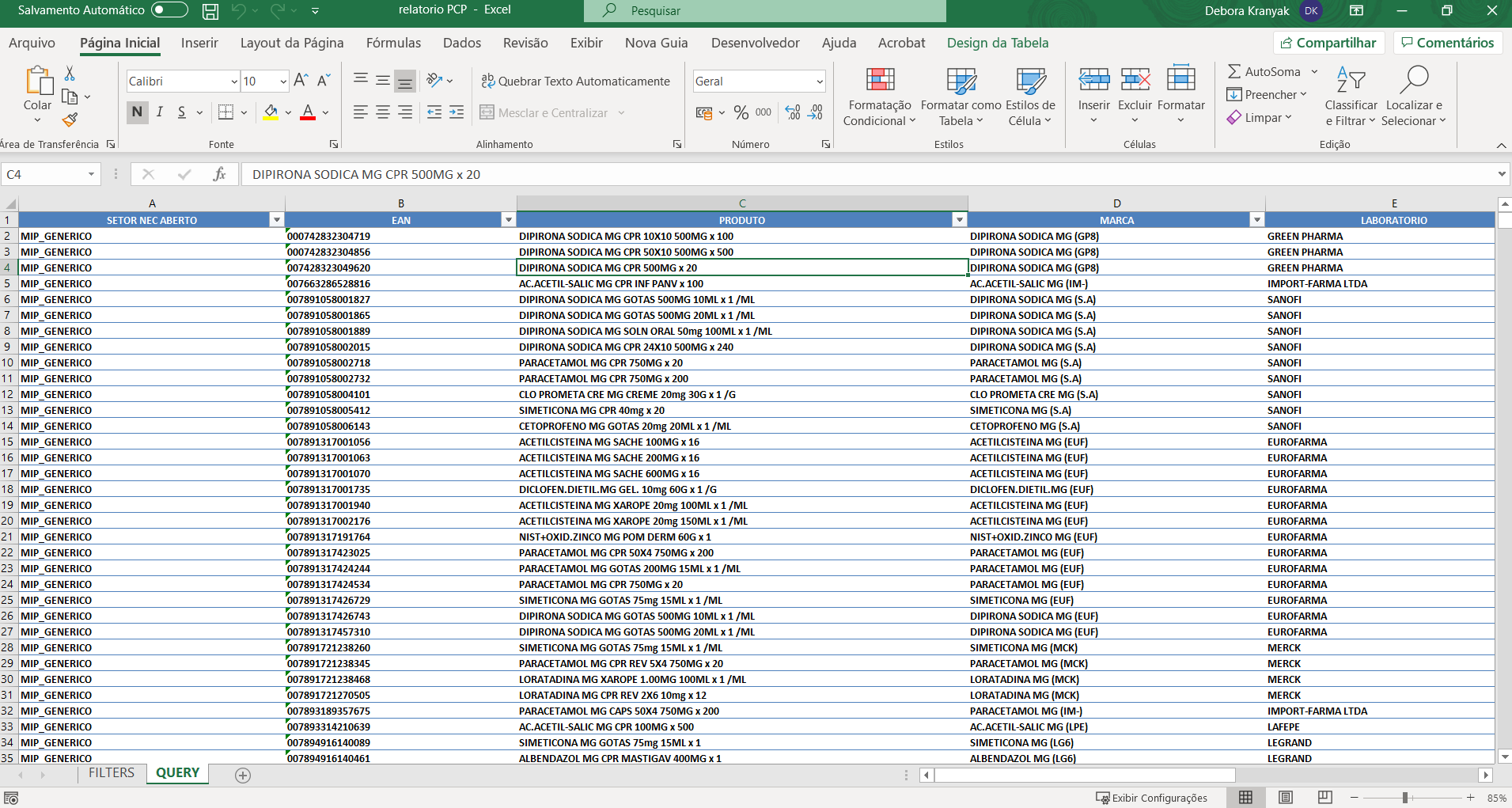 Clicar “Produto” > Arrastar para “linhas” os itens: SETOR NEC ABERTO, EAN, PRODUTO, MOLÉCULA, LABORATÓRIO, CLASSE 1