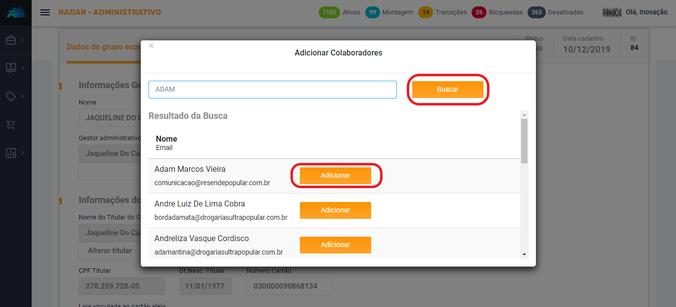 O departamento de Expansão é responsável em questionar ao associado quem será o responsável por esse cartão, para que seja cadastrado no Radar e para que o departamento Financeiro, responsável em providenciar esse cartão, possa vinculá-lo ao CPF do responsável.