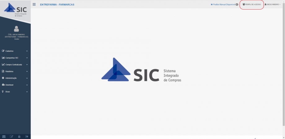 Primeiramente, deve alterar o perfil, clicando em “Perfil de acesso