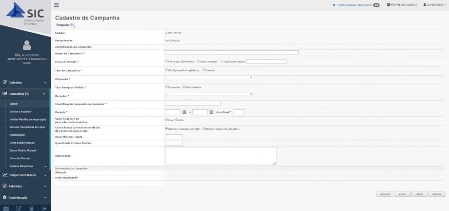 Caso a campanha/oferta tenha alguma particularidade deve ser informado também no campo observação.
