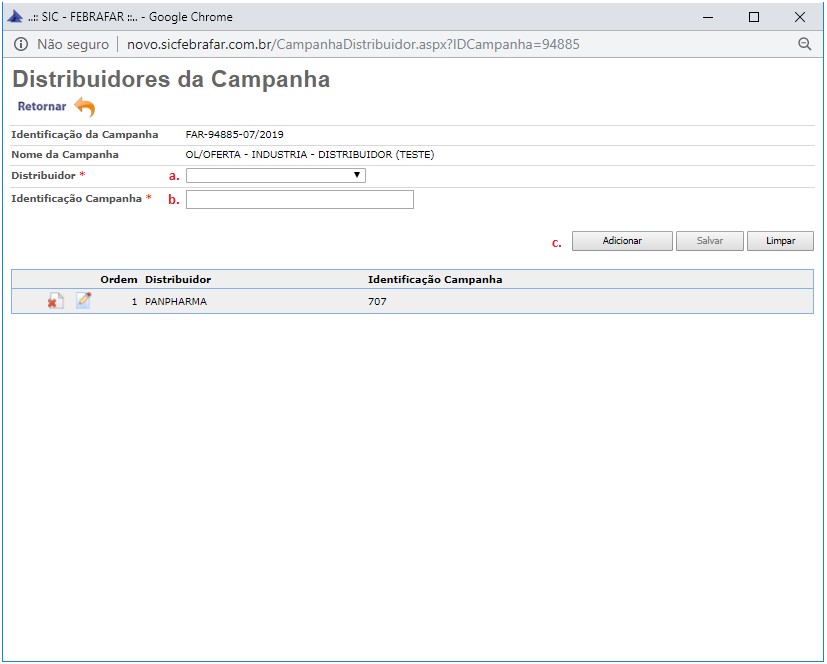 Selecionar o distribuidor (a.) , incluir o código do apontador (b.) O código inserido aqui é o mesmo digitado em: Identificação campanha no receptor) e adicionar (c.)