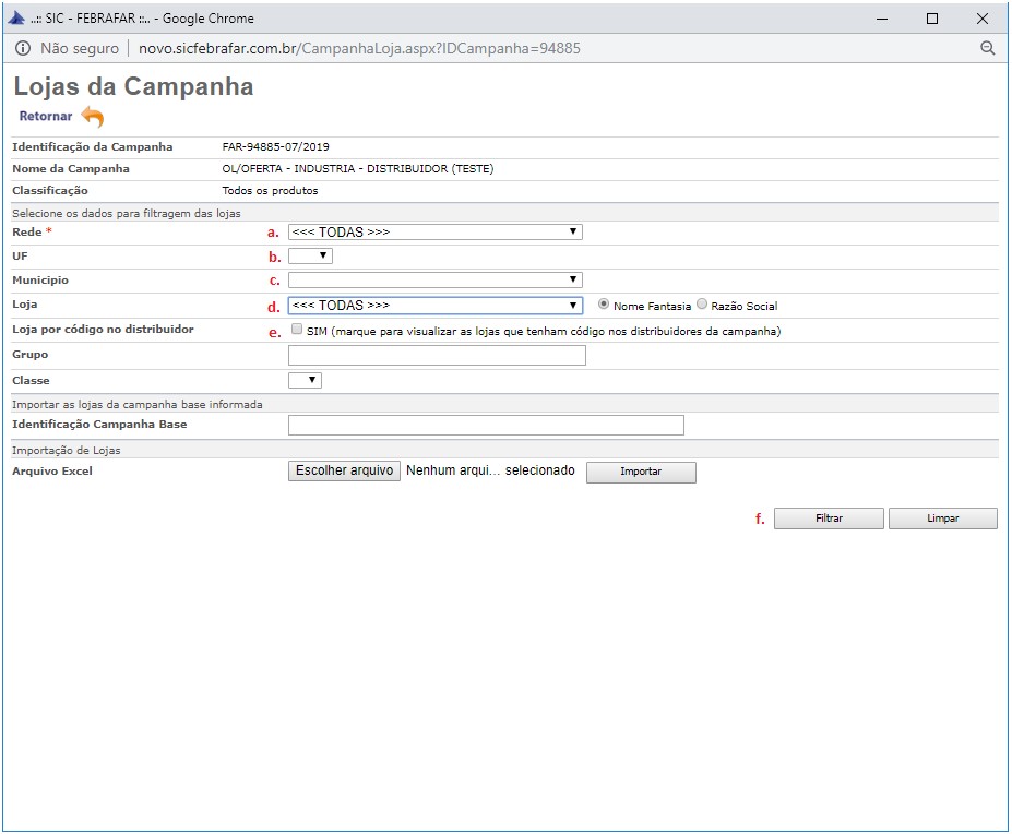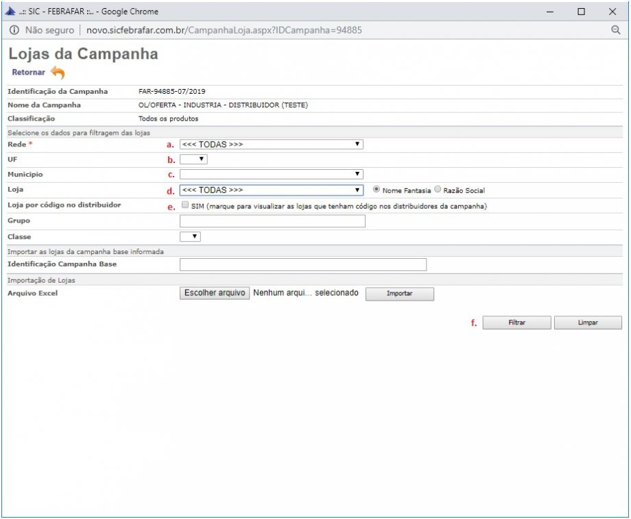 f. Filtrar: Mostra a relação de lojas que terá acesso a campanha/oferta.