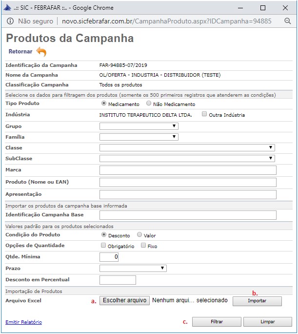 a. Escolher arquivo: Selecionar a grade enviada (em excel) pela indústria/distribuidor.