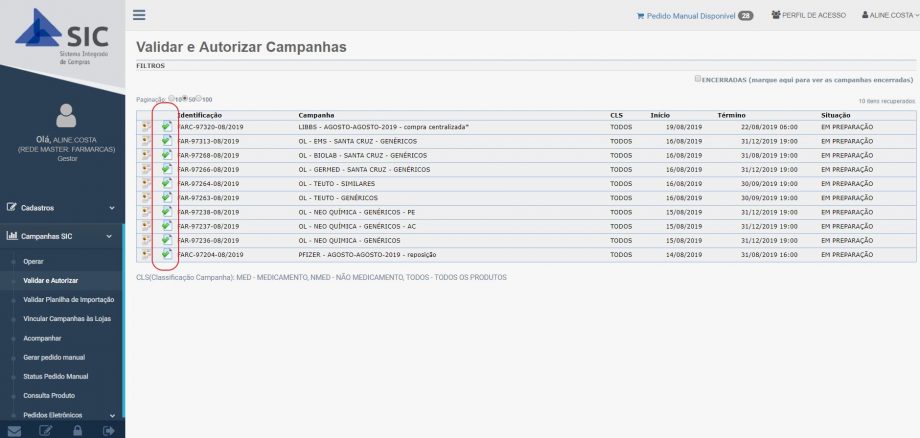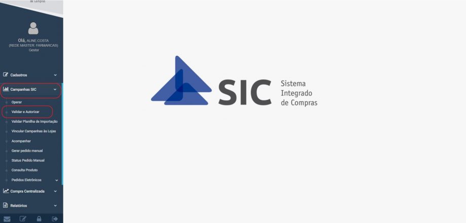 Clicar em “Campanhas SIC” e opção “Validar e Autorizar” no menu lateral esquerdo.