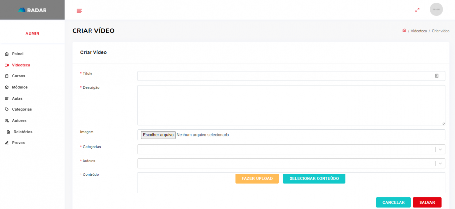 Categoria: Selecionar a categoria onde esse vídeo será disponibilizado (Essa categoria já deve estar criada no menu “Categorias”)