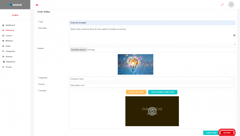 Após preencher todos os campos e inserir o vídeo desejado, clique em “Salvar”