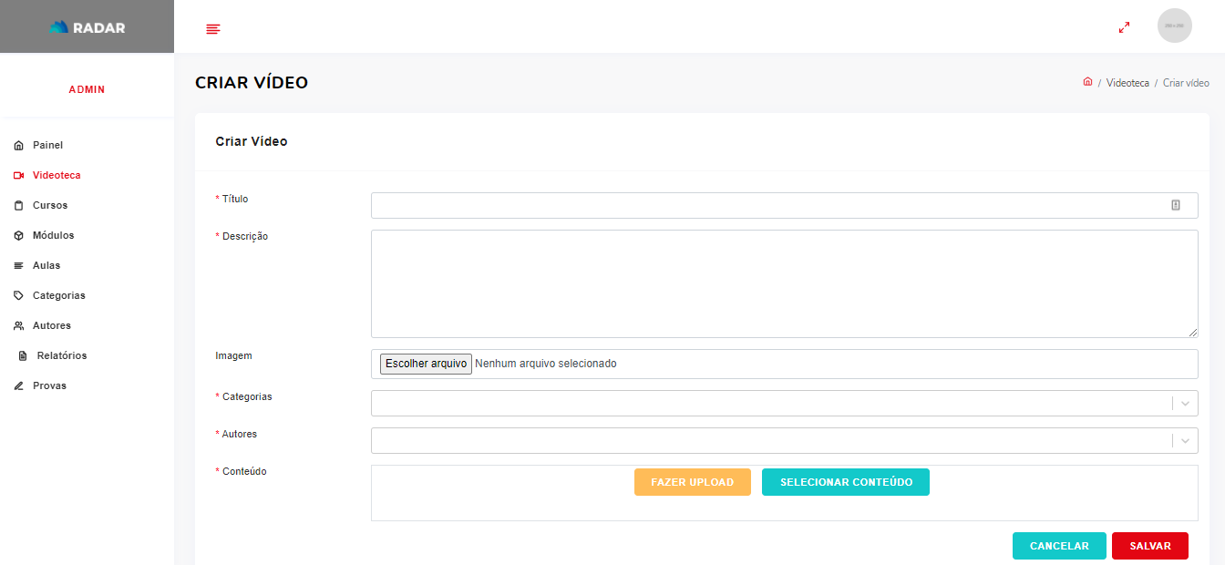 Categoria: Selecionar a categoria onde esse vídeo será disponibilizado (Essa categoria já deve estar criada no menu “Categorias”)