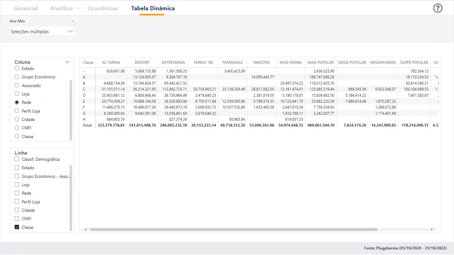 Já no segundo exemplo, foi selecionado para a coluna o campo de “Rede” e na linha “Classe”. Nesta visão não fica claro o período, pois removemos visualmente da tabela o campo “Ano Mês”, mas caso queira conferir, basta verificar o filtro os meses selecionados.
