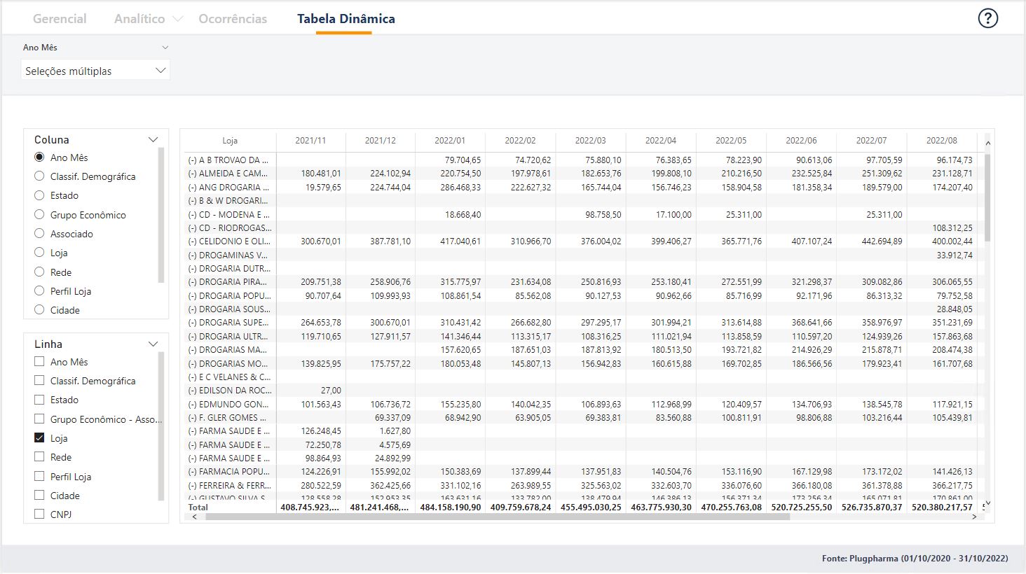 No exemplo abaixo, foi selecionado para a coluna o campo de “Ano Mês” e na linha “Loja”. Caso queira trazer um histórico menor é possível também através do filtro de “Ano Mês” na parte superior.
