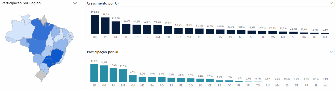 No exemplo acima, ao clicar na uf de Roraima no gráfico de barras, o mapa de calor ao lado esquerdo já destacou somente o estado selecionado.