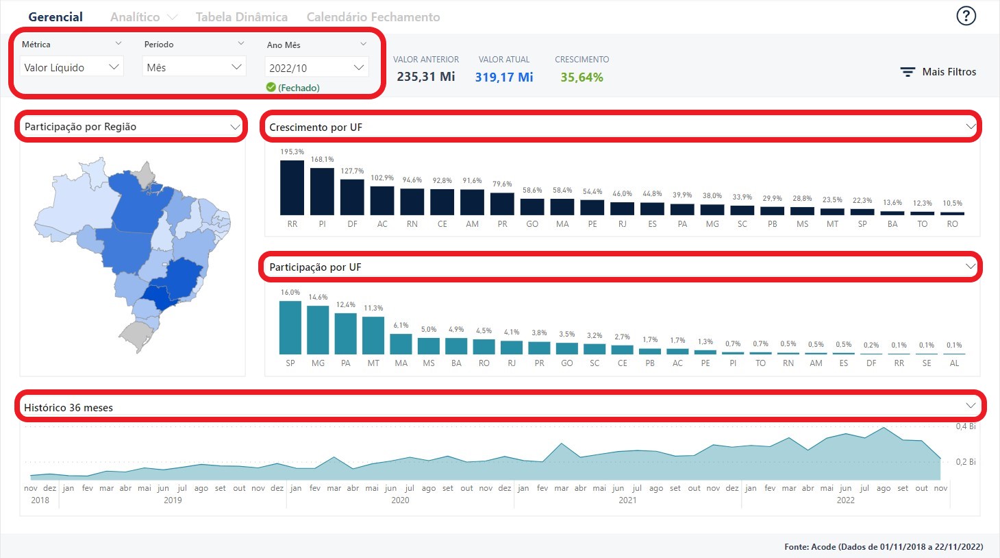 Essa opção de filtro tem como objetivo evidenciar os principais campos que influenciam os indicadores de negócio como por exemplo a seleção de métricas e período de análises.