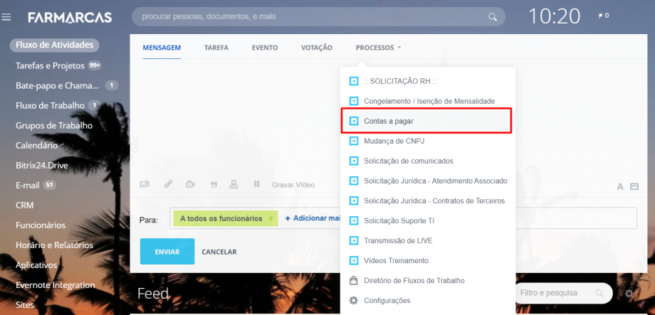 No canto superior da tela inicial do Bitrix, clique em MAIS e escolha a opção Processos.