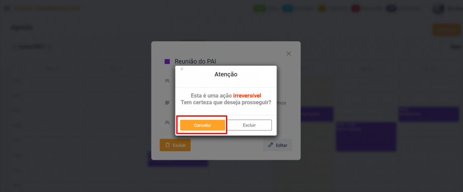 Para excluir o evento, clique na opção excluir, ou cancelar, caso desista da exclusão da agenda.