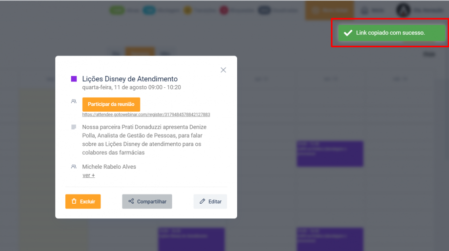 Clique no botão que aparecerá no canto superior direito “Link copiado com sucesso”