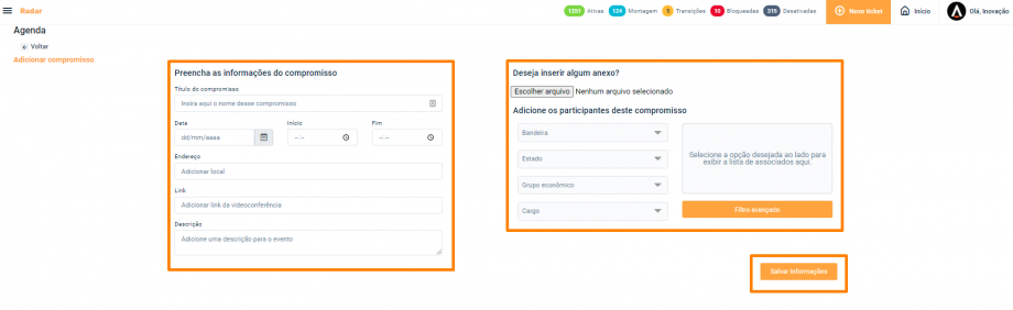 - Endereço: Em caso de compromisso presencial, coloque o logradouro