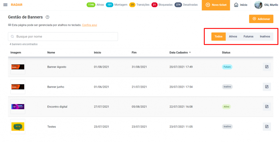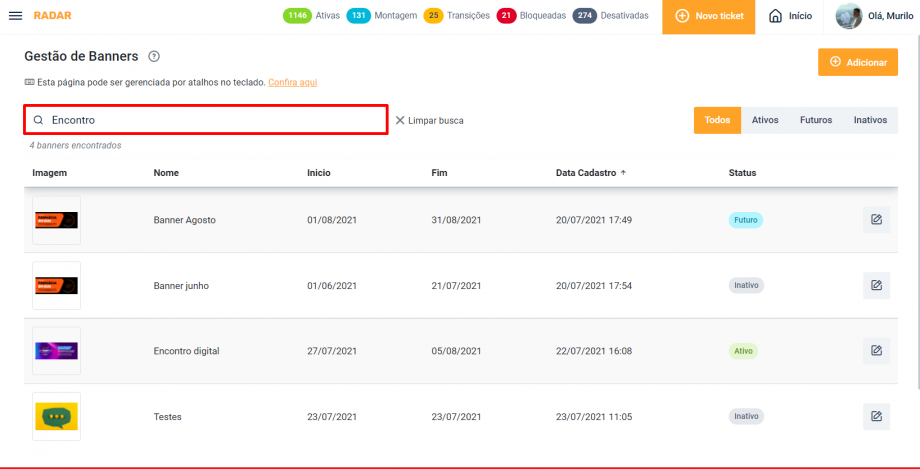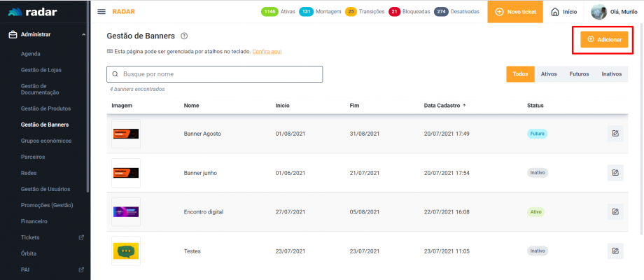 Clique no botão Adicionar para iniciar o cadastro do banner