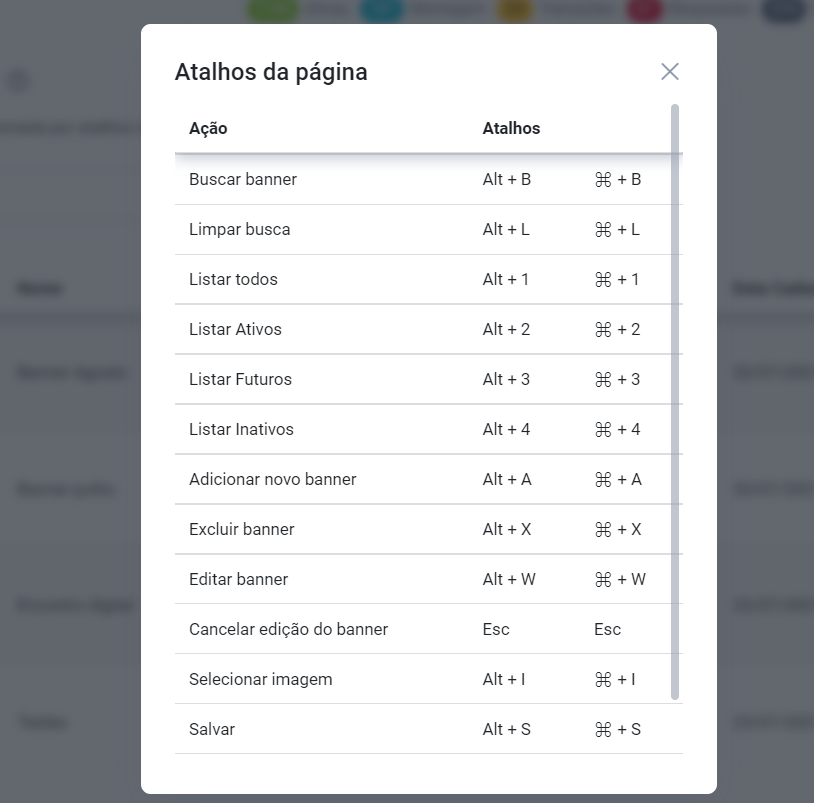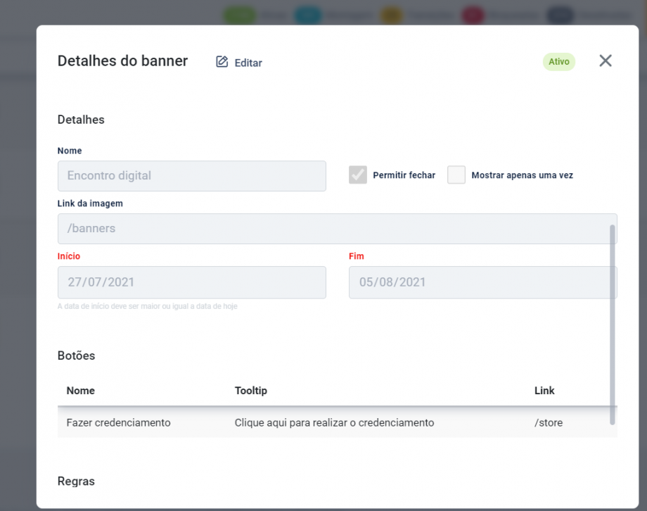 – Permissão: O banner estará disponível apenas para os usuários com permissões selecionadas.