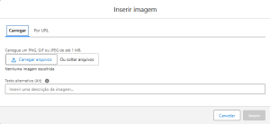 Inserindo imagens: Clique no ícone de imagem, carregue o arquivo e adicione uma descrição (texto alternativo) para acessibilidade e contexto.