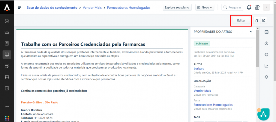Para que ele possa consultar esses parceiros, é necessário adiciona-los no artigo do radar conhecimento do Freshdesk