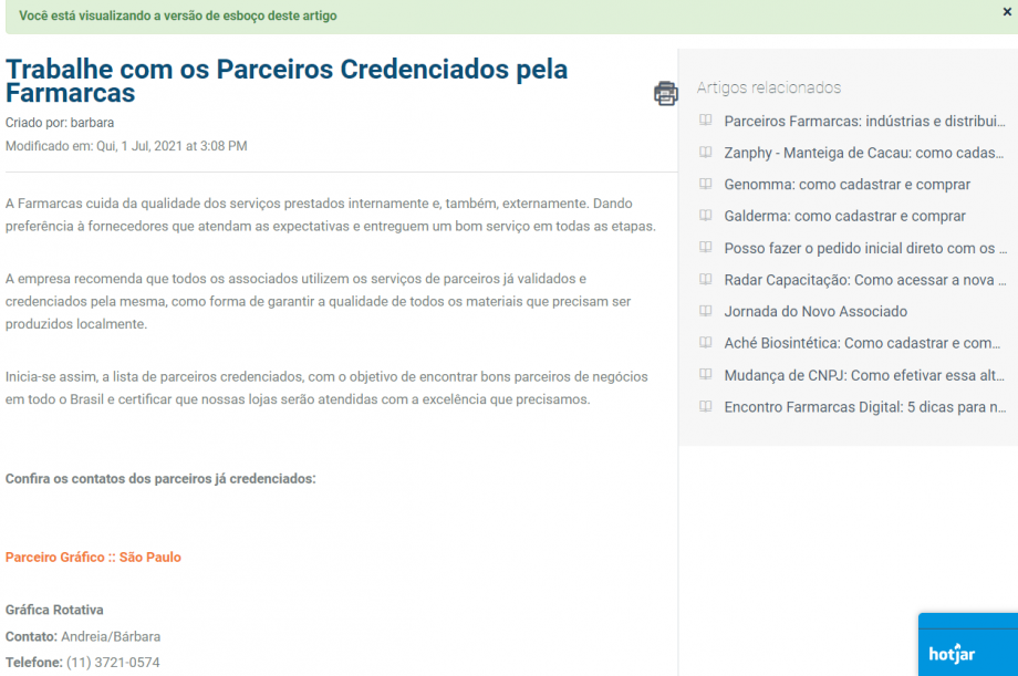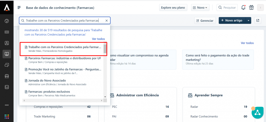 - Na caixa Pesquisar, escreva o nome do artigo: Trabalhe com os Parceiros Credenciados pela Farmarcas, clique no artigo que estará disponível na lista de opções.