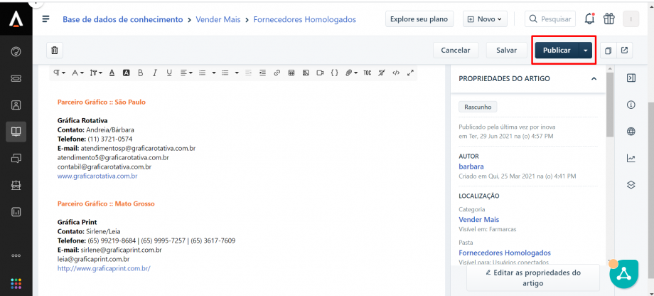 - Escreva no corpo do texto, seguindo a formatação existente e insira os dados do novo parceiro. Clique em Salvar e em seguida Publicar.