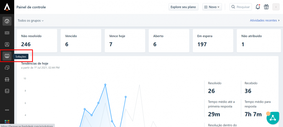 - Ao acessar o Freshdesk, clique no menu lateral e escolha a opção Solução.