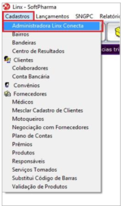 2. Assim que acessado, Vá até Cadastro/Administradora Linx Conecta.