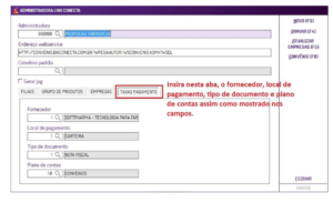 4.Na imagem abaixo, é mostrado como configurar a aba taxas de pagamento, deverão ser alimentadas ao sistema as informações de Fornecedor, Local de Pagamento, Tipo de documento e Plano de contas.