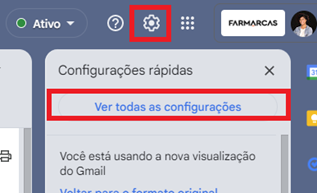 Acesse o GMAIL e vá até as configurações no canto superior direito e em seguida clique em “Ver todas as configurações”