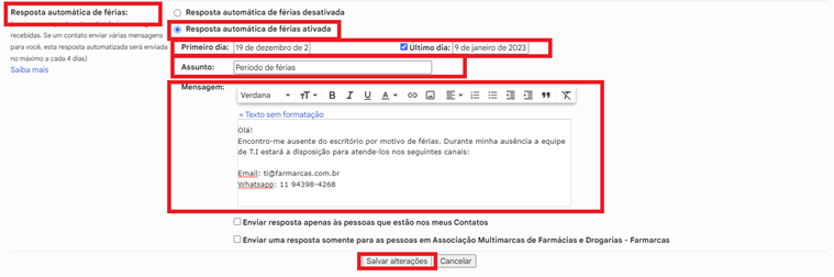 Ao finalizar a configuração, clique em “Salvar alterações”. Pronto, a mensagem automática foi configurada no seu e-mail.