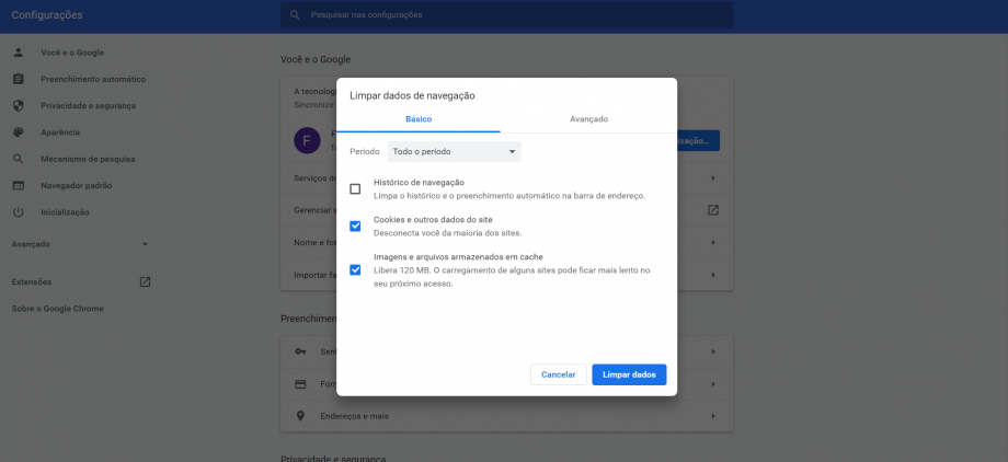 Marque as caixas das opções “Cookies e outros dados do site” e “Imagens e arquivos armazenados em cache”