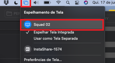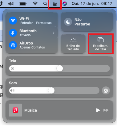 Para utilizar a transmissão do seu Mac para a Tv com o Airplay, vá na parte superior direita da tela e clique no ícone de seleção, em seguida clique na opção “Espelhamento de tela”.