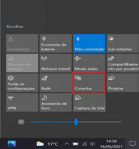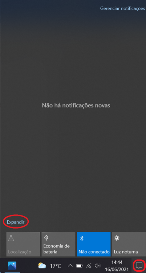 Para utilizar a transmissão do notebook para a Tv usando o wifi-direct, clique no ícone de caixa no canto inferior da tela, e em seguida clique em expandir.
